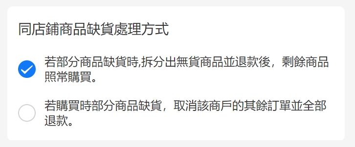 ⚠如果在採購過程中發現某商品缺貨,請選擇缺貨的處理方式,後續會根據您的選擇進行採購。